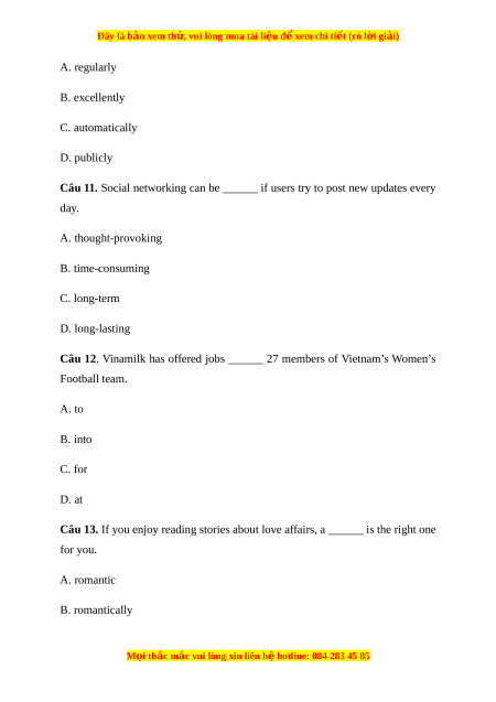 Câu 11. Social networking can be ______ if users try to post new updates every day. A. thought-provoking B. time-consuming C. long-term D. long-lasting