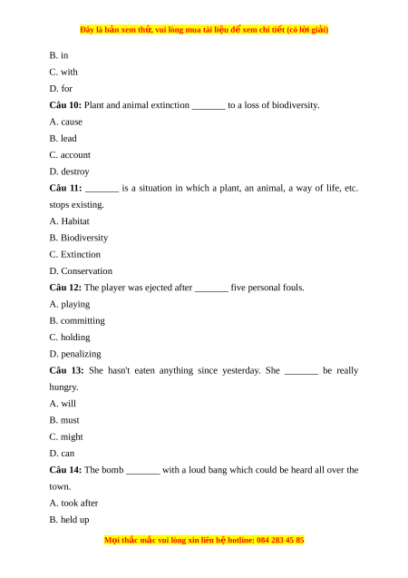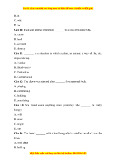 Câu 10: Plant and animal extinction _______ to a loss of biodiversity. A. cause B. lead C. account D. destroy