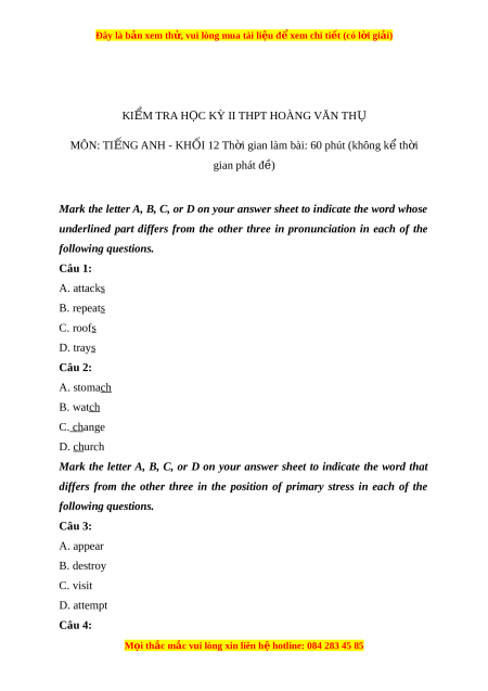 following questions. Câu 1: A. attacks B. repeats C. roofs D. trays Câu 2: A. stomach B. watch C. change D. church