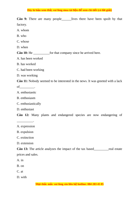 Câu 13: The article analyzes the impact of the tax based_________real estate prices and sales. A. in B. on C. at D. with M i ọ thắc m c