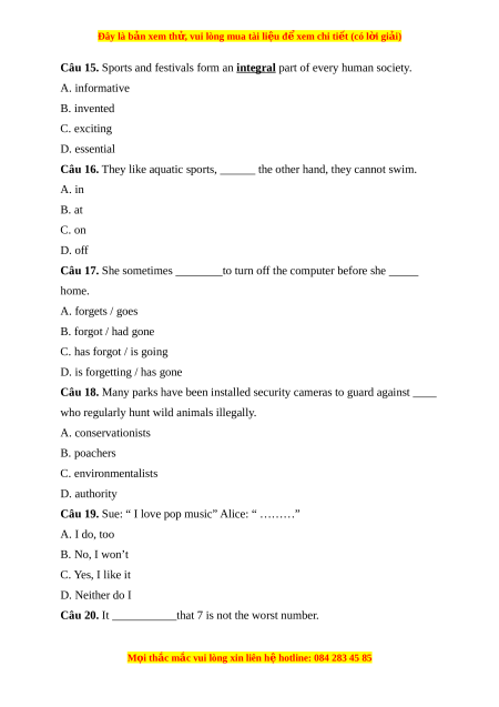 Câu 15. Sports and festivals form an integral part of every human society. A. informative B. invented C. exciting D. essential