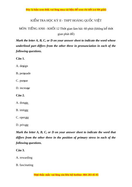 Đây là bản xem th , vu ử i lòng mua tài li u ệ đ xe ể m chi ti t ế (có l i ờ gi i ả ) KIỂM TRA H C Ọ KỲ II - THPT HOÀNG QU C Ố VI T Ệ MÔN: TI N Ế G ANH - KH I Ố 12 Th i