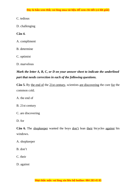 Đây là bản xem th , vu ử i lòng mua tài li u ệ đ xe ể m chi ti t ế (có l i ờ gi i ả ) C. tedious D. challenging Câu 4. A. compliment B. determine C. optimist D. marvelous