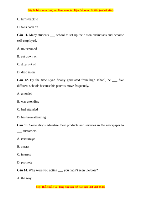 Câu 11. Many students ___ school to set up their own businesses and become self-employed. A. move out of B. cut down on C. drop out of D. drop in on