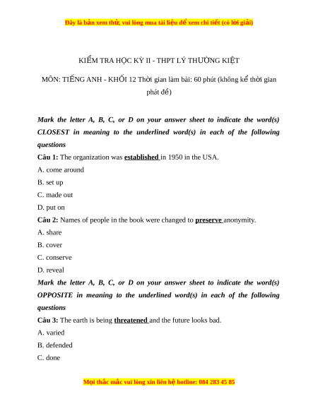 Đây là bản xem th , vu ử i lòng mua tài li u ệ đ xe ể m chi ti t (c ế ó l i ờ gi i ả ) KI M Ể TRA H C Ọ KỲ II - THPT LÝ TH N ƯỜ G KI T Ệ MÔN: TI N Ế G ANH - KH I Ố 12 Th i