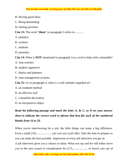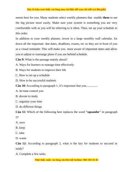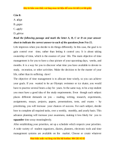 Câu 10: According to paragraph 1, it’s important that you............... A. let time control you B. devote to study C. organize your time D. do different things