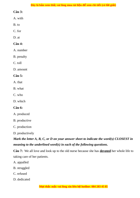 Đây là bản xem th , vu ử i lòng mua tài li u ệ đ xe ể m chi ti t (c ế ó l i ờ gi i ả ) Câu 3: A. with B. to C. for D. at Câu 4: A. number B. penalty C. toll D. amount Câu 5: A. that B. what C. who D. which Câu 6: A. produced B. productive C. production D. productively