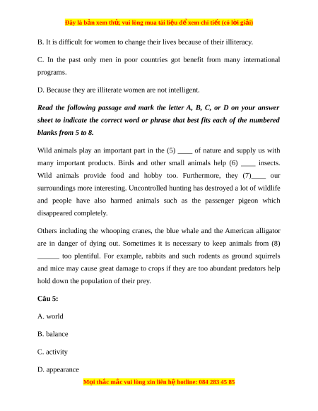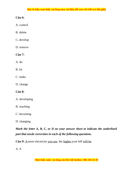 Đây là bản xem th , vu ử i lòng mua tài li u ệ đ xe ể m chi ti t (c ế ó l i ờ gi i ả ) Câu 6: A. control B. delete C. develop D. remove Câu 7: A. do B. let C. make D. change Câu 8: A. developing B. reaching C. becoming D. changing