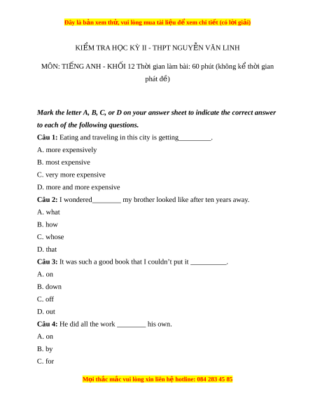 Đây là bản xem th , vu ử i lòng mua tài li u ệ đ xe ể m chi ti t (c ế ó l i ờ gi i ả ) KI M Ể TRA H C Ọ KỲ II - THPT NGUY N Ễ VĂN LINH MÔN: TI N Ế G ANH - KH I Ố 12 Th i