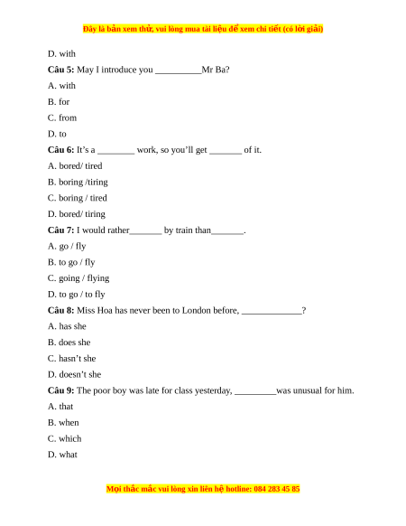 Câu 5: May I introduce you __________Mr Ba? A. with B. for C. from D. to