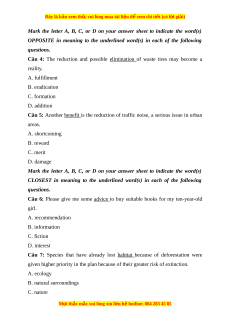 Câu 4: The reduction and possible elimination of waste tires may become a reality. A. fulfillment B. eradication C. formation D. addition