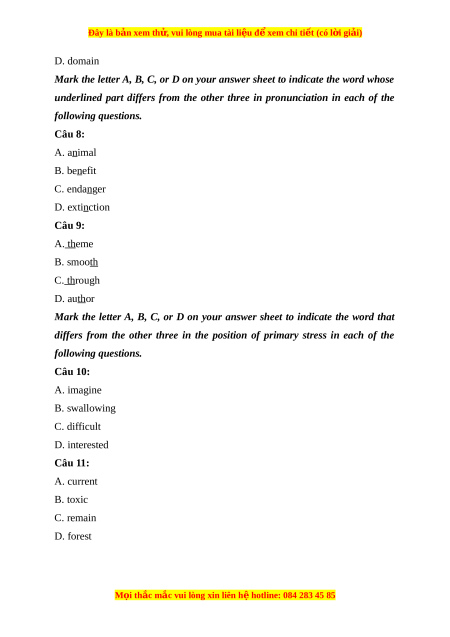 following questions. Câu 10: A. imagine B. swallowing C. difficult D. interested Câu 11: A. current B. toxic C. remain D. forest M i ọ thắc m c