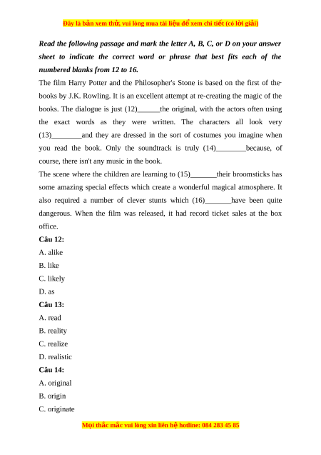dangerous. When the film was released, it had record ticket sales at the box office. Câu 12: A. alike B. like C. likely D. as Câu 13: A. read B. reality C. realize D. realistic Câu 14: A. original B. origin C. originate M i ọ thắc m c
