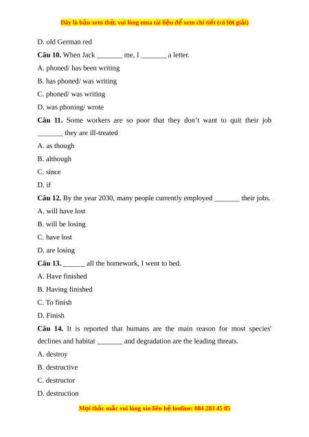Câu 12. By the year 2030, many people currently employed _______ their jobs. A. will have lost B. will be losing C. have lost D. are losing