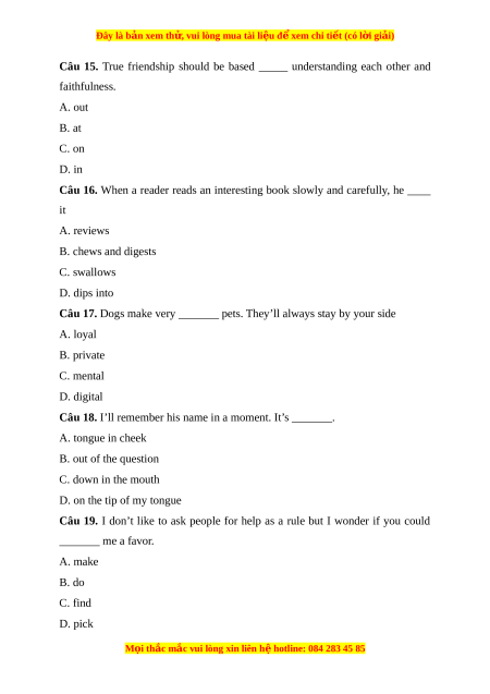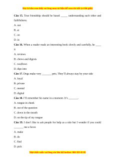 Câu 15. True friendship should be based _____ understanding each other and faithfulness. A. out B. at C. on D. in