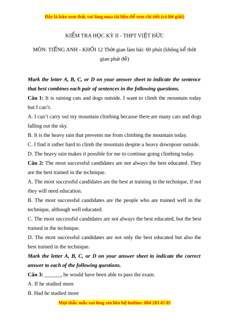 Đây là bản xem th , vu ử i lòng mua tài li u ệ đ xe ể m chi ti t ế (có l i ờ gi i ả ) KI M Ể TRA H C Ọ KỲ II - THPT VI T Ệ Đ C Ứ MÔN: TI N Ế G ANH - KH I Ố 12 Th i
