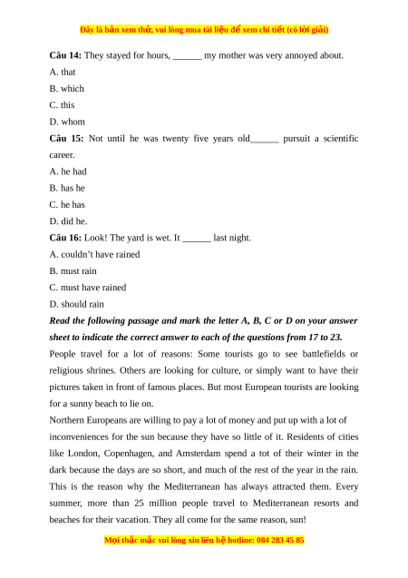 Câu 14: They stayed for hours, ______ my mother was very annoyed about. A. that B. which C. this D. whom