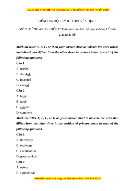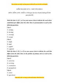 Đây là bản xem th , vu ử i lòng mua tài li u ệ đ xe ể m chi ti t ế (có l i ờ gi i ả ) KI M Ể TRA H C Ọ KỲ II - THPT YÊN Đ N Ị H I MÔN: TI N Ế G ANH - KH I Ố 12 Th i