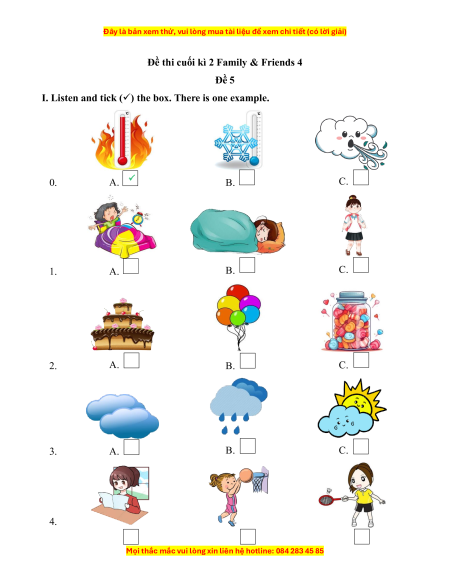 Đề thi cuối kì 2 Tiếng Anh lớp 4 Family and Friends (Đề 5 kèm file nghe)
