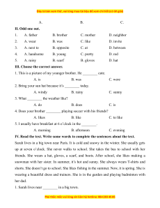 A. B. C. II. Odd one out. 1. A. father B. brother C. mother D. neighbor 2. A. wear B. was C. like D. invite 3. A. next to B. opposite C. at D. between 4. A. handsome B. young C. pretty D. red 5. A. rainy B. scarf B. gloves D. hat