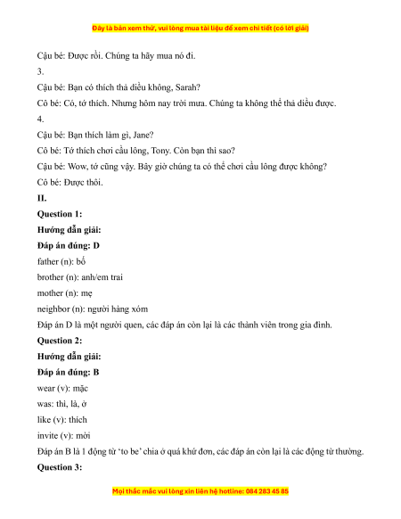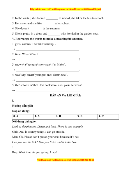 ĐÁP ÁN VÀ LỜI GIẢI: I. Hướng dẫn giải: Đáp án đúng: 0. A 1. A 2. B 3. B 4. C Nội dung bài nghe: