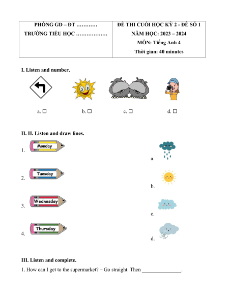 NĂM HỌC: 2023 – 2024 MÔN: Tiếng Anh 4 Thời gian: 40 minutes I. Listen and number. a. ⬜ b. ⬜ c. ⬜ d. ⬜