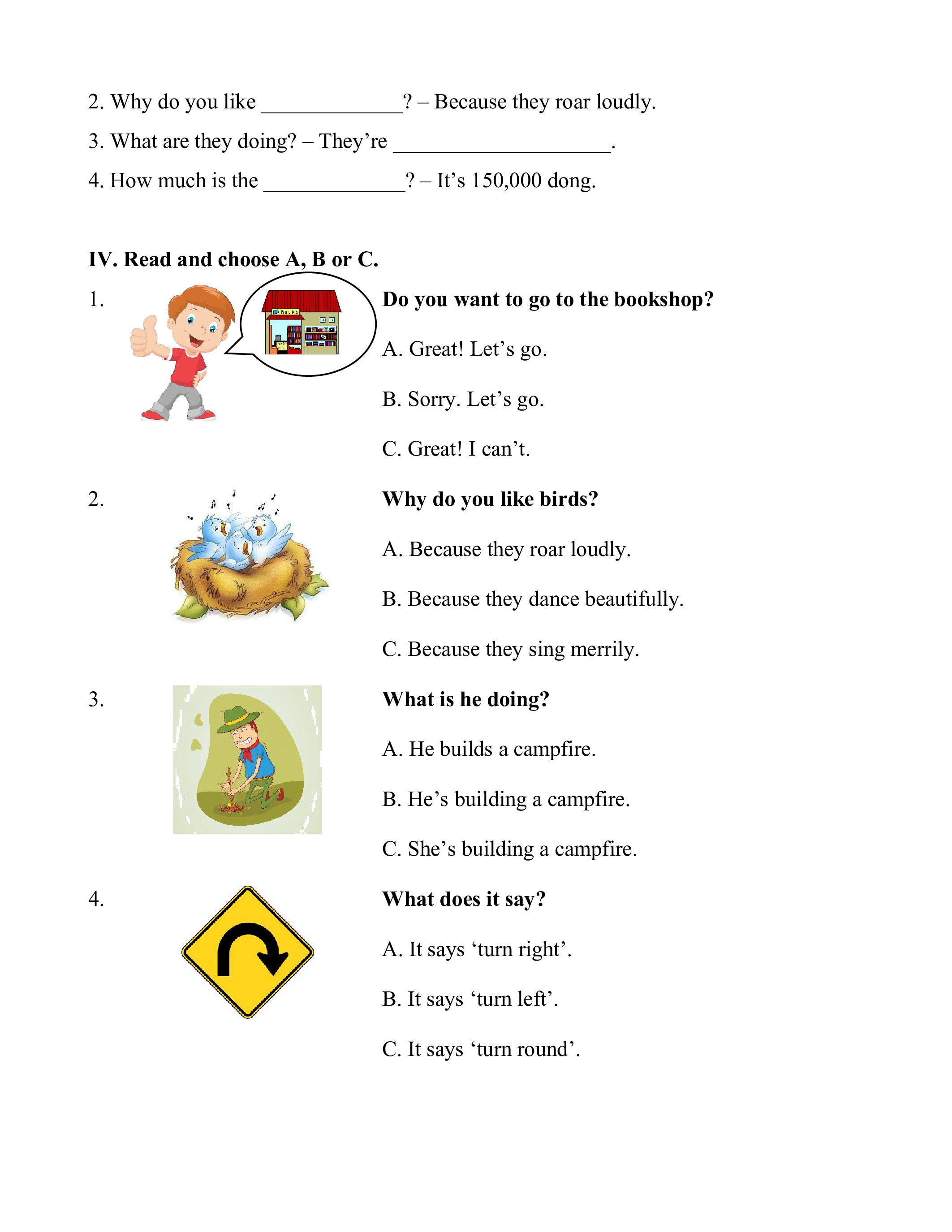 Do you want to go to the bookshop? A. Great! Let’s go. B. Sorry. Let’s go. C. Great! I can’t. 2. Why do you like birds? A. Because they roar loudly.