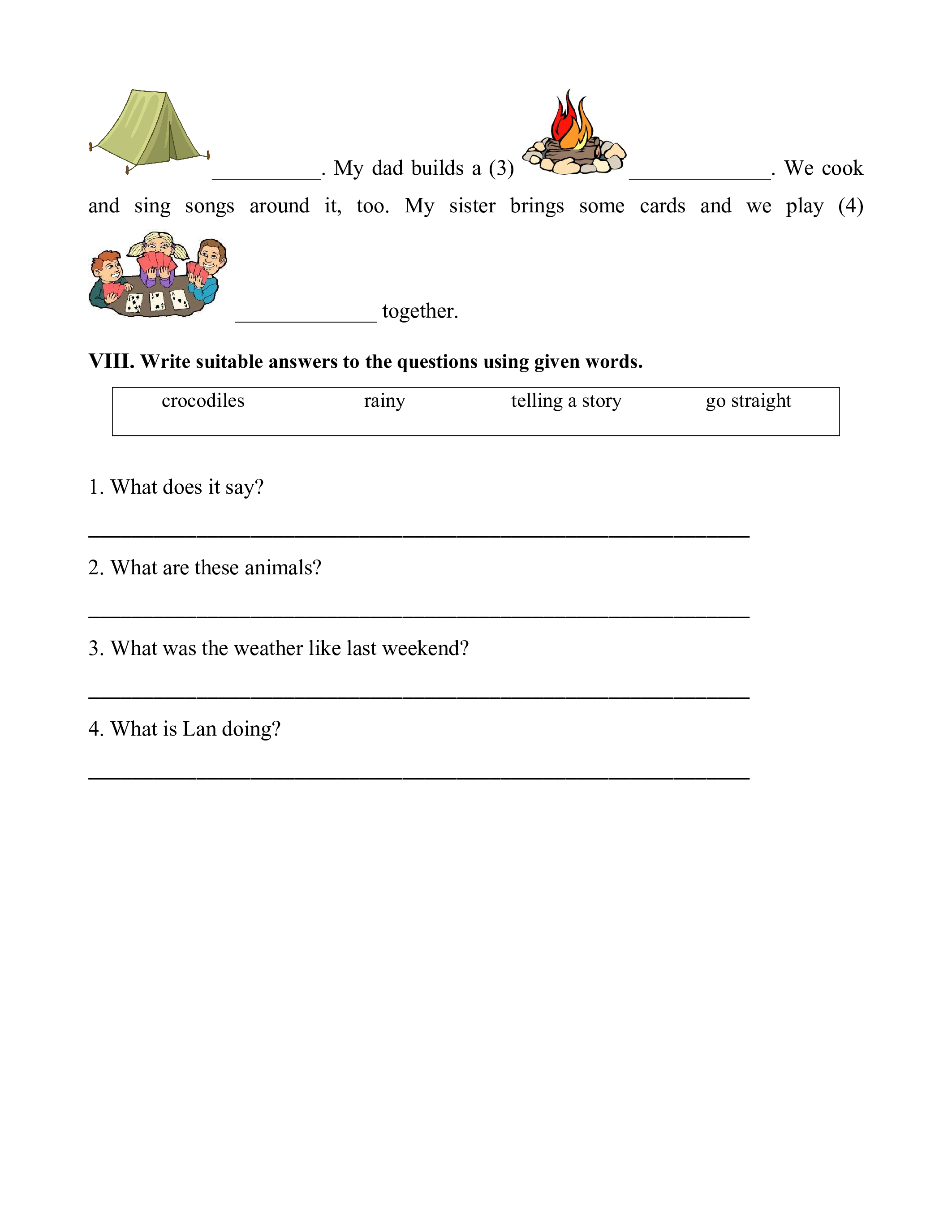 VIII. Write suitable answers to the questions using given words. crocodiles rainy telling a story go straight 1. What does it say?