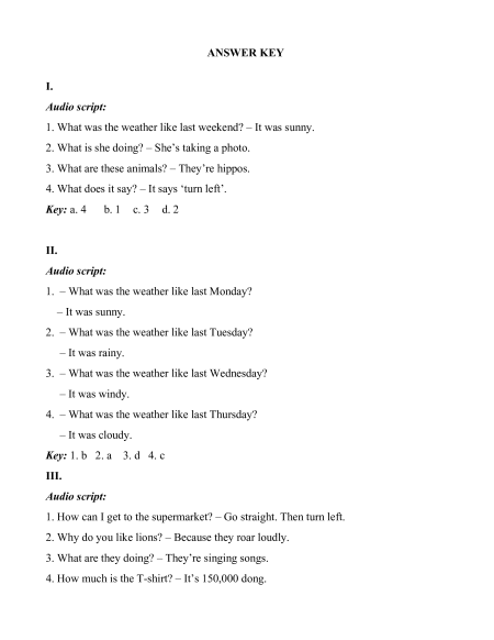 II. II. Listen and draw lines. 1. a. 2. b. 3. c. 4. d. III. Listen and complete.