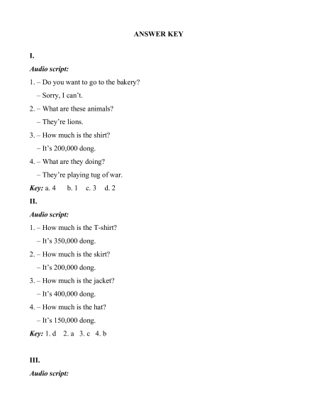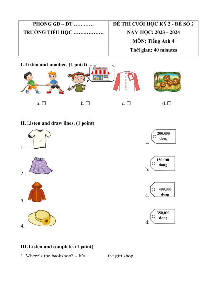 II. Listen and draw lines. (1 point) 200,000 dong a. 1. 150,000 dong b. 2. 400,000 c. dong 3. 350,000 dong d. 4.