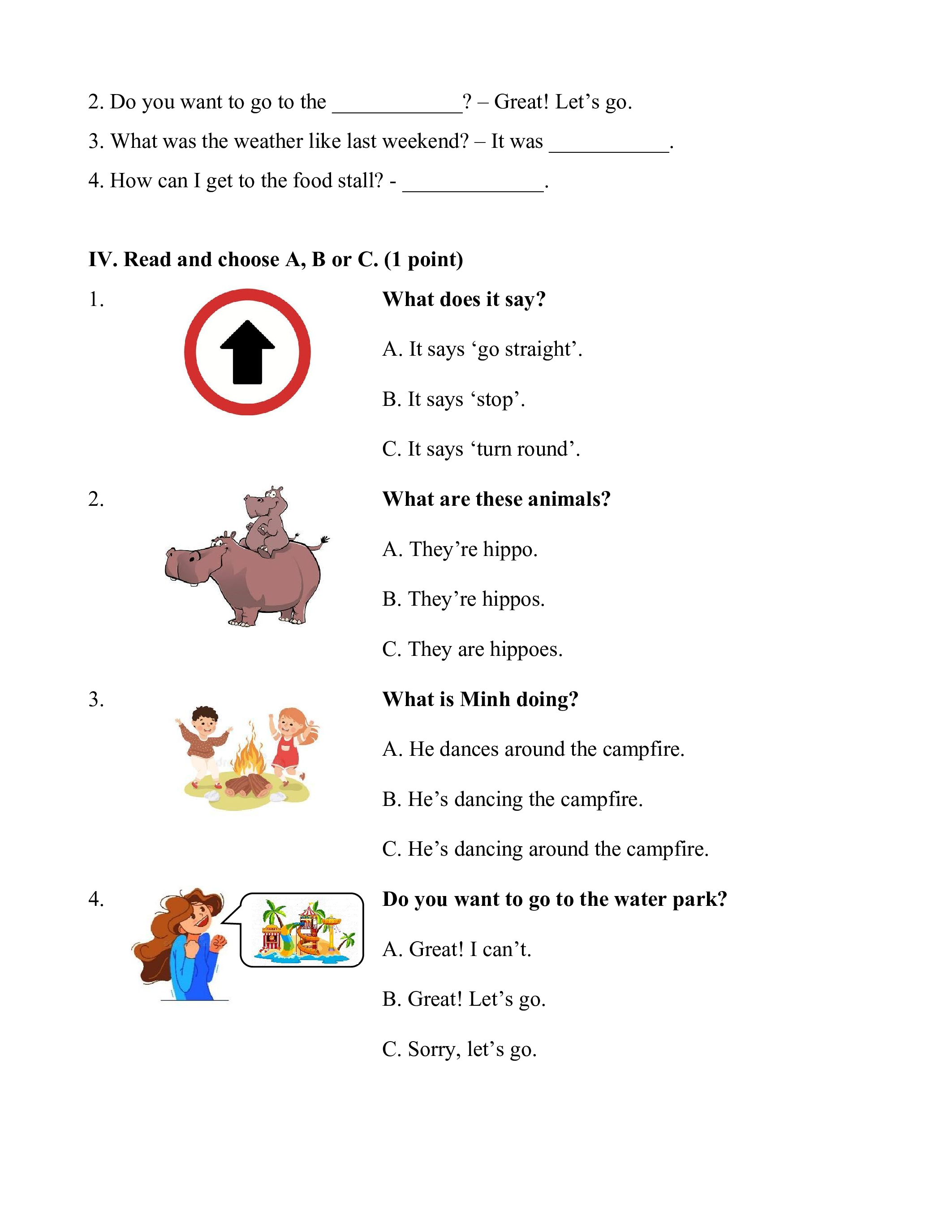 IV. Read and choose A, B or C. (1 point) 1. What does it say? A. It says ‘go straight’. B. It says ‘stop’. C. It says ‘turn round’. 2. What are these animals? A. They’re hippo. B. They’re hippos. C. They are hippoes. 3. What is Minh doing?