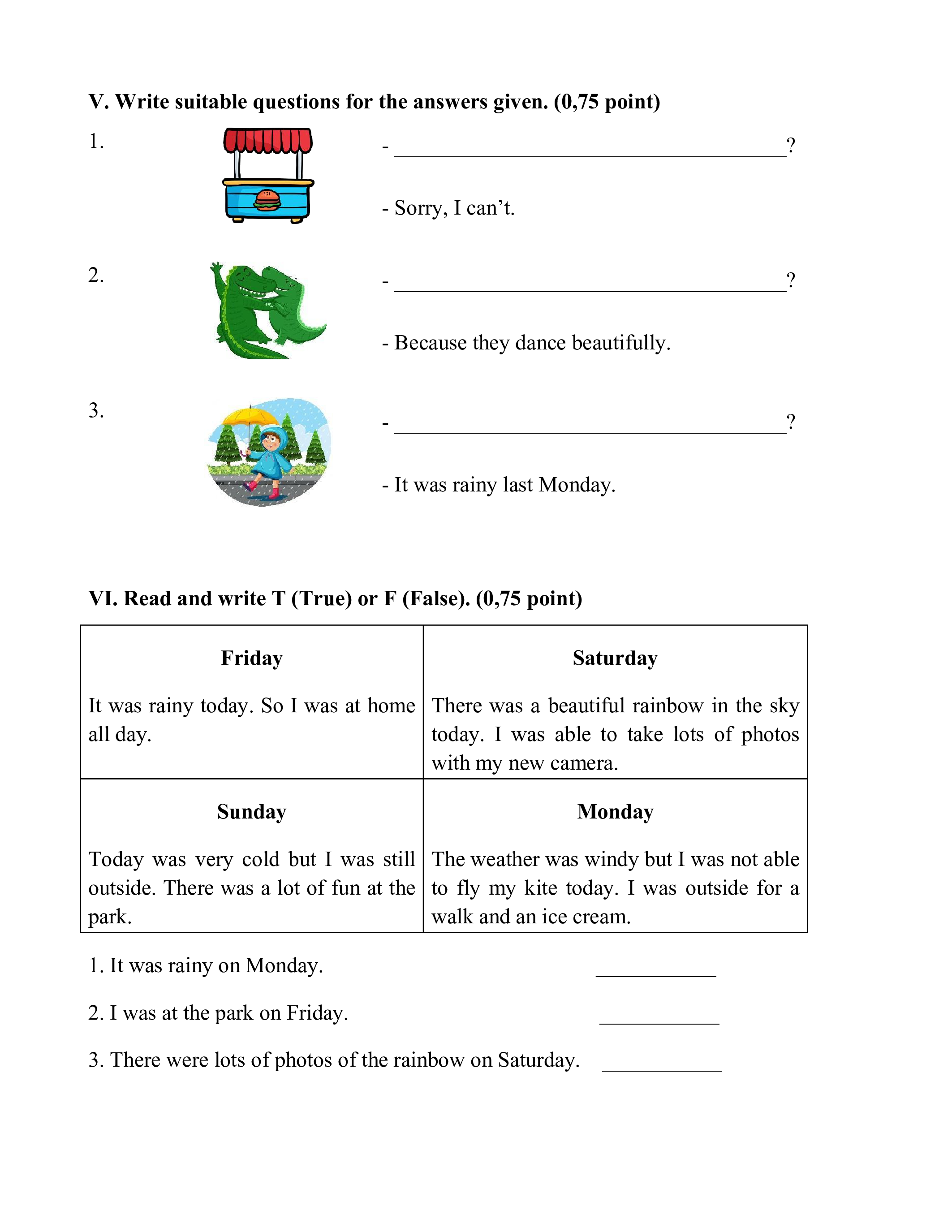 VI. Read and write T (True) or F (False). (0,75 point) Friday Saturday
