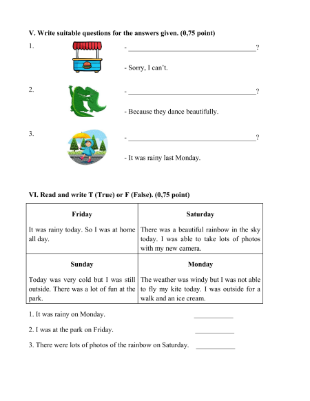 outside. There was a lot of fun at the to fly my kite today. I was outside for a park. walk and an ice cream. 1. It was rainy on Monday. ___________