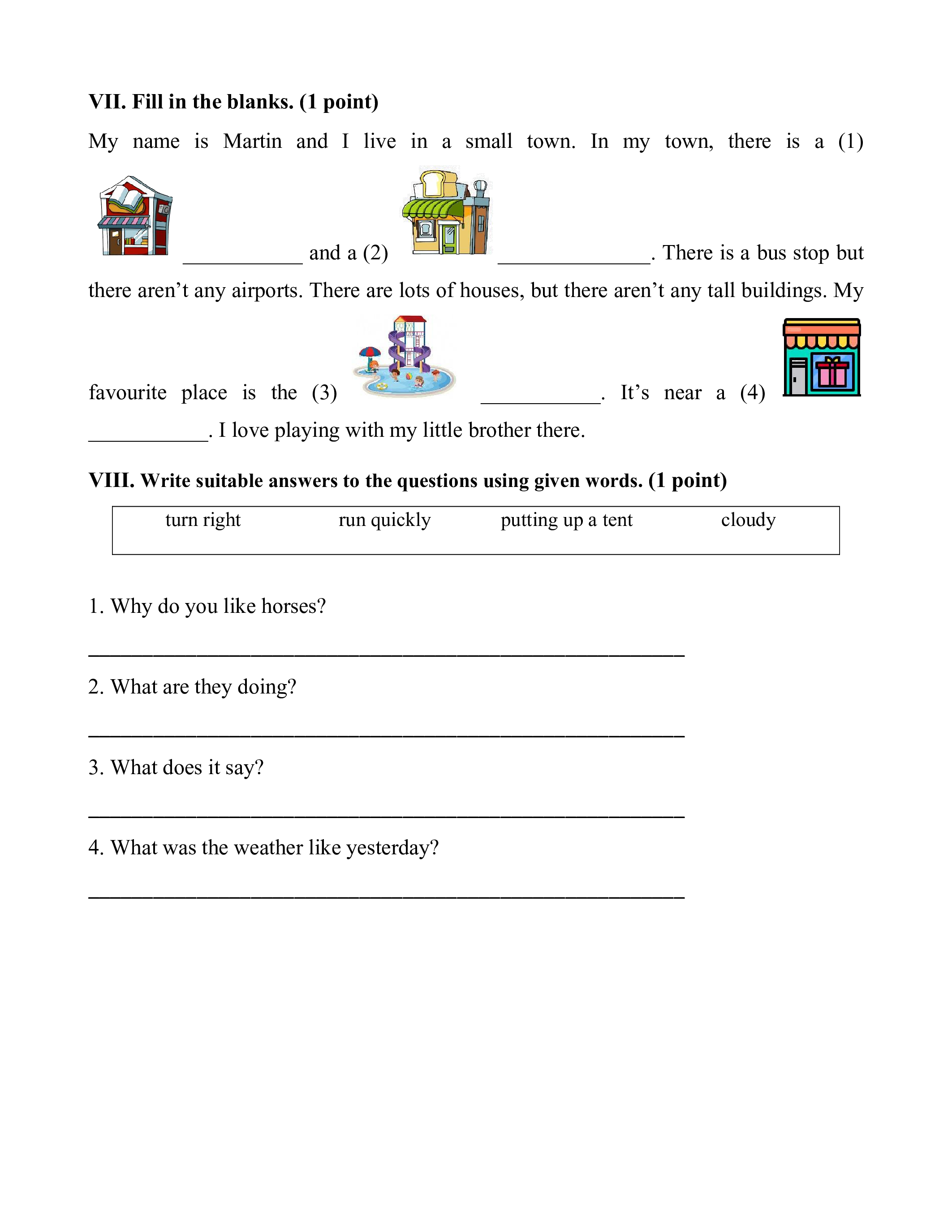 VIII. Write suitable answers to the questions using given words. (1 point) turn right run quickly putting up a tent cloudy 1. Why do you like horses?