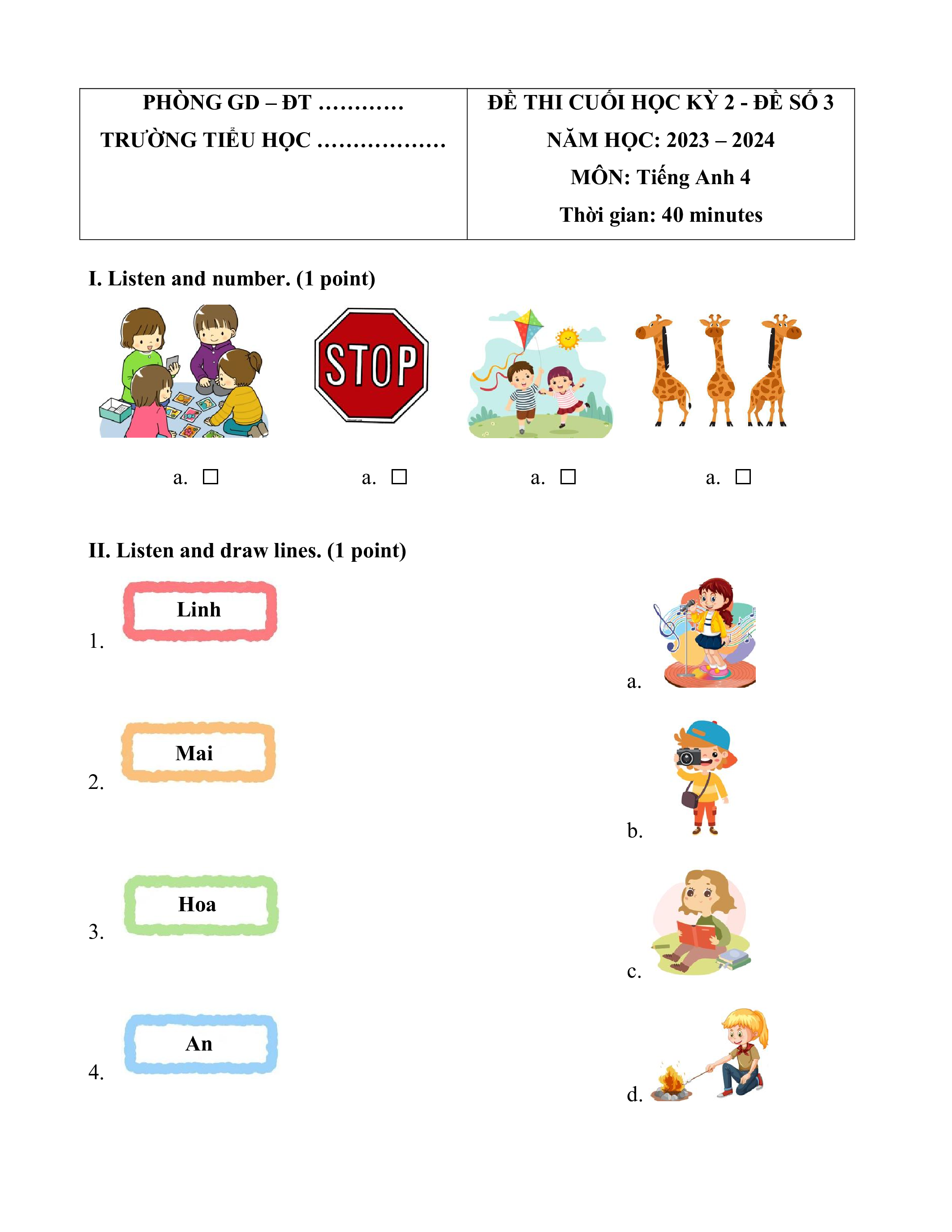 NĂM HỌC: 2023 – 2024 MÔN: Tiếng Anh 4 Thời gian: 40 minutes