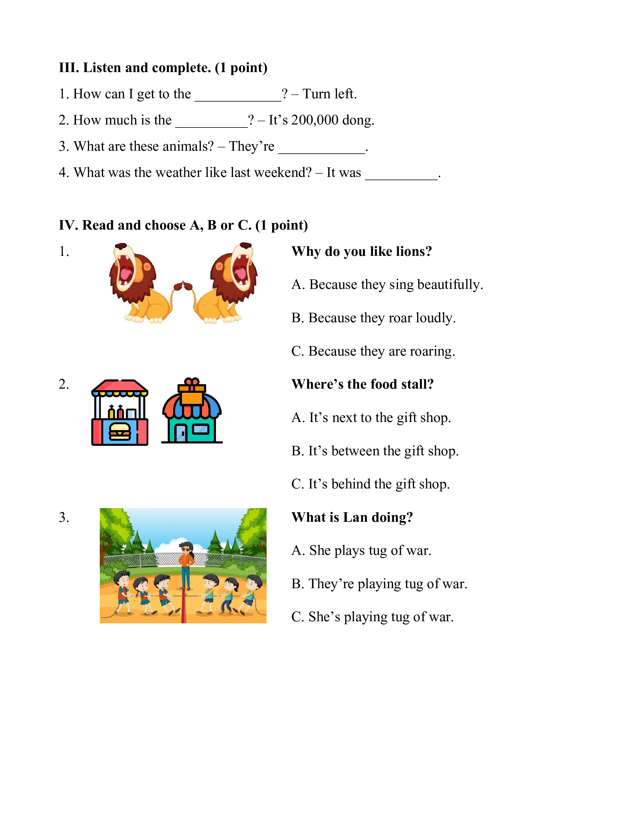 IV. Read and choose A, B or C. (1 point) 1. Why do you like lions?