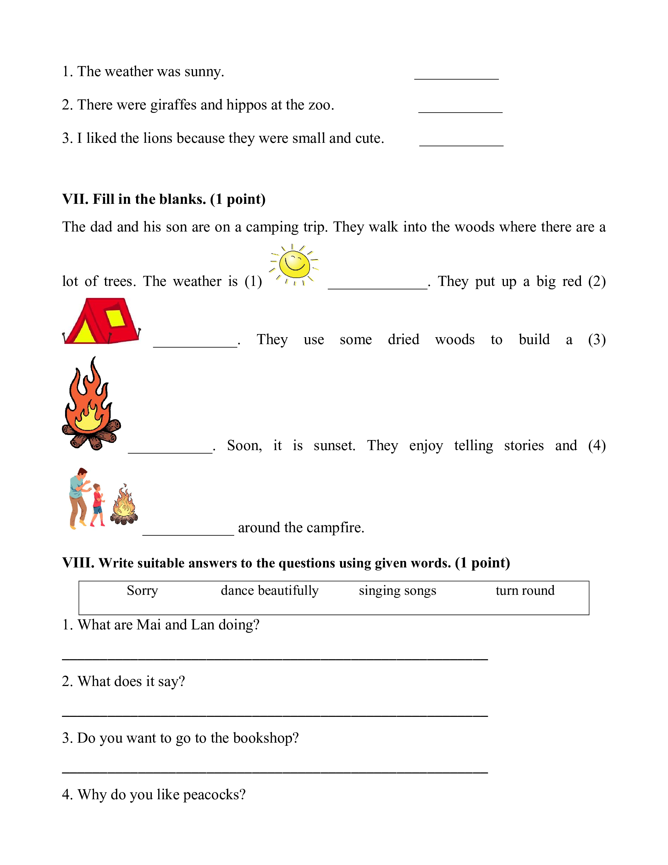 VIII. Write suitable answers to the questions using given words. (1 point) Sorry dance beautifully singing songs turn round 1. What are Mai and Lan doing?