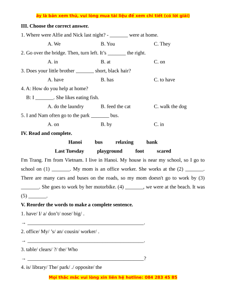 5. I and Nam often go to the park _______ bus. A. on B. by C. in IV. Read and complete. Hanoi bus relaxing bank