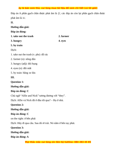 Đáp án A phần gạch chân được phát âm là /ʃ/, các đáp án còn lại phần gạch chân được phát âm là /s/. II. Hướng dẫn giải: Đáp án đúng: 1. take out the trash 2. farmer 3. hungry 4. eyes 5. by train Dịch: