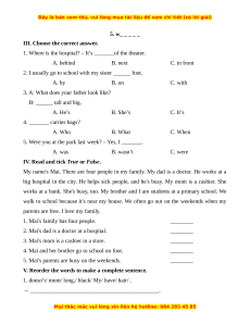 3. A: What does your father look like? B: ______ tall and big. A. He’s B. She’s C. It’s 4. _______ carries bags? A. Who B. What C. When