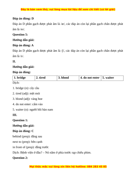 Đáp án D phần gạch được phát âm là /ʃ/, các đáp án còn lại phần gạch chân được phát âm là /s/. II. Hướng dẫn giải: Đáp án đúng: 1. bridge 2. tired 3. blond