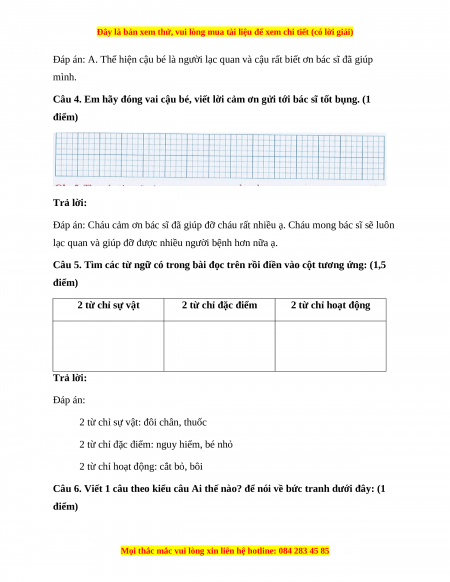 Câu 4. Em hãy đóng vai cậu bé, viết lời cảm ơn gửi tới bác sĩ tốt bụng. (1 điểm) Trả lời: