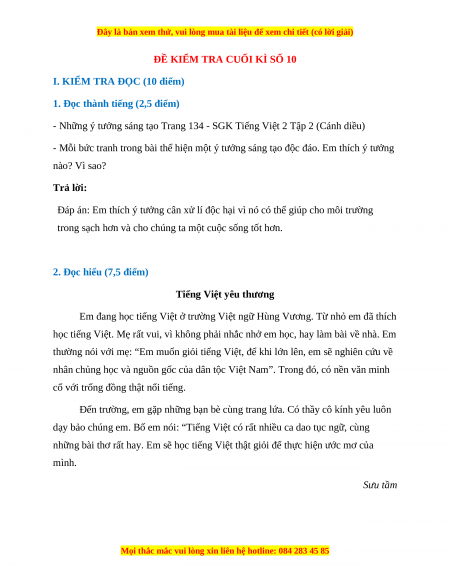 Đề thi cuối kì 2 Tiếng Việt lớp 2 Cánh diều (Đề 10)