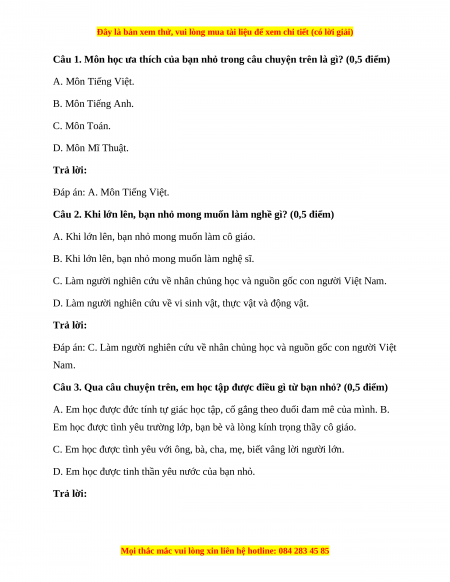 Câu 1. Môn học ưa thích của bạn nhỏ trong câu chuyện trên là gì? (0,5 điểm) A. Môn Tiếng Việt. B. Môn Tiếng Anh. C. Môn Toán. D. Môn Mĩ Thuật. Trả lời: