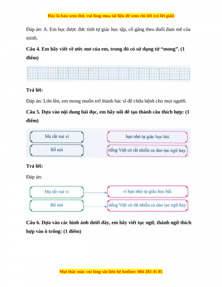 Câu 4. Em hãy viết về ước mơ của em, trong đó có sử dụng từ “mong”. (1 điểm) Trả lời: