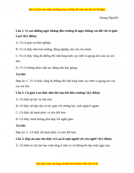 Câu 3. Đáp án nào cho thấy cô Lan là một người rất yêu nghề? (0,5 điểm)