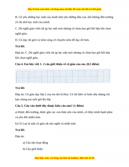 Câu 4. Em hãy viết 1- 2 câu giới thiệu về cô giáo của em. (0,5 điểm) Trả lời: