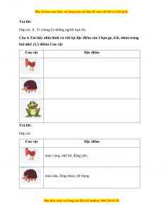 bài nhé! (1,5 điểm) Con vật Con vật Đặc điểm Trả lời: Đáp án: Con vật Đặc điểm