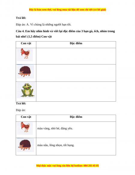 Câu 4. Em hãy nhìn hình và viết lại đặc điểm của 3 bạn gà, ếch, nhím trong