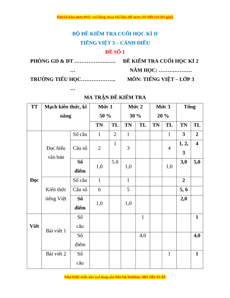 Mạch kiến thức, kĩ Mức 1 Mức 2 Mức 3 Tổng năng 50 % 30 % 20 % TN TL TN TL TN TL TN TL Số câu 1 2 1 1 3 2 1 1, 2, 4 Đọc hiểu Câu số 2 3 4 3 văn bản Số 5.0 3,0 5,0 1,0 1,0 1,0 điểm Đọc Số câu 1 1 2 Kiến thức Câu số 6 5 5, 6 tiếng Việt Số 2,0 1,0 1,0 điểm Số 1 1 Viết câu Bài viết 1 Số 4,0 4,0 điểm Bài viết 2 Số 1 1 câu